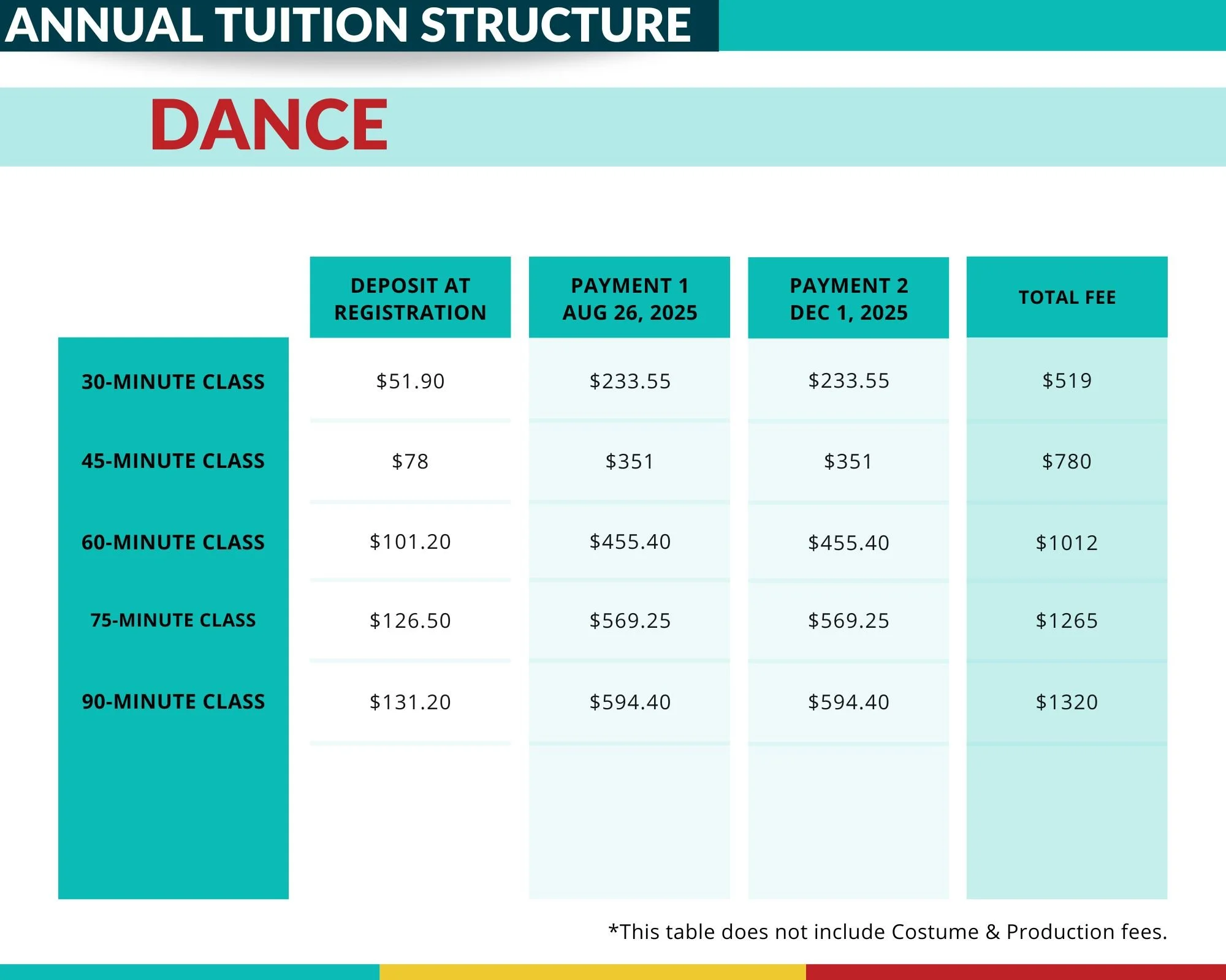 January — Term 2 enrollment opens for selective classes. Classes resume. Costume/production payments processed.*